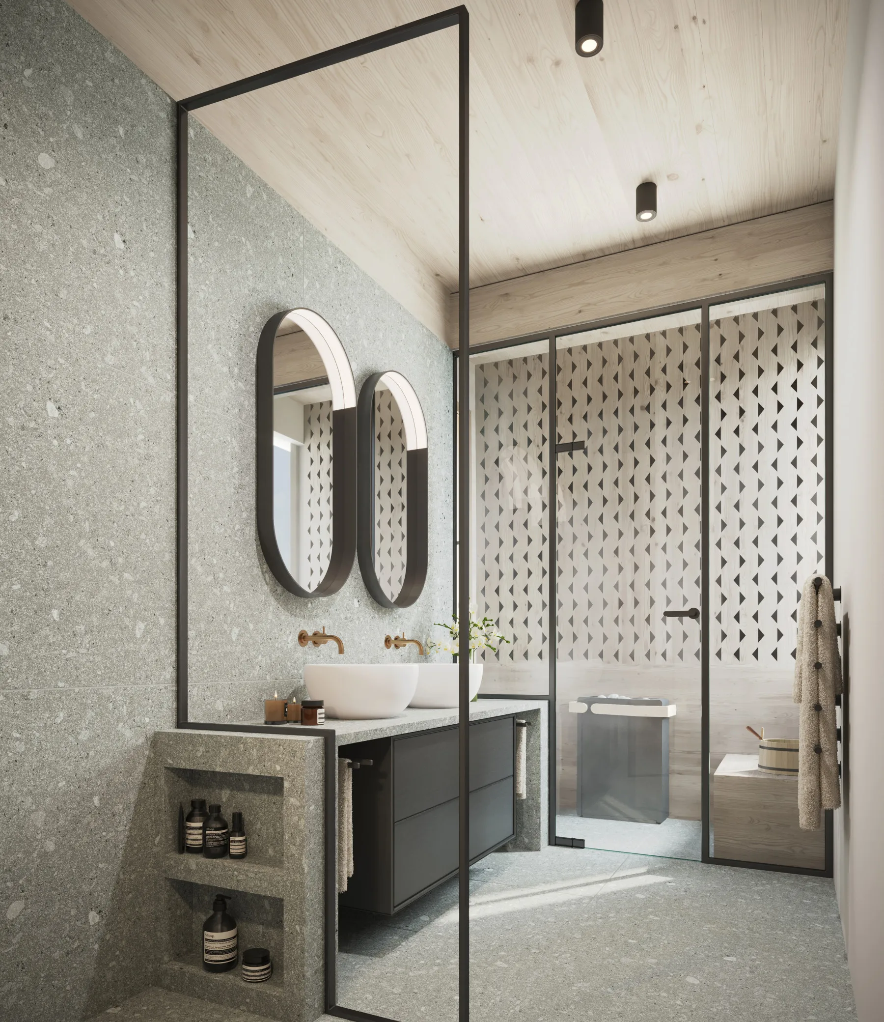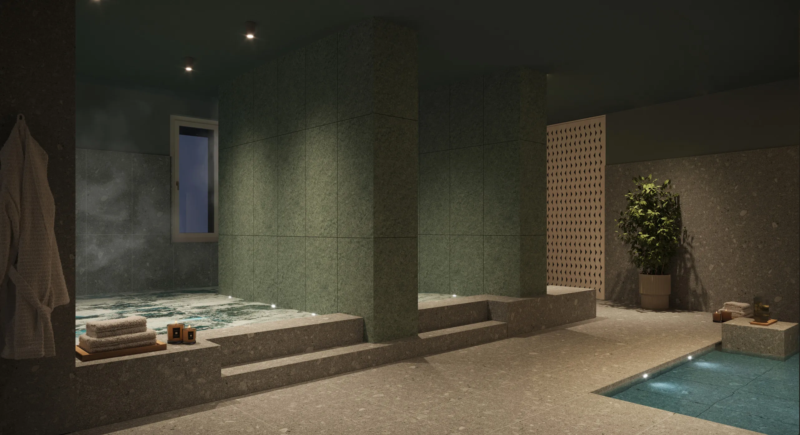 Viele der Residences verfügen über eine private Sauna. Sie wird durch Fenster mit natürlichem Licht erhellt und ist umgeben von einem in Stein und Holz gehaltenen Badezimmer, das an die kristallklaren Flüsse und Bergquellen von Andermatt erinnert.