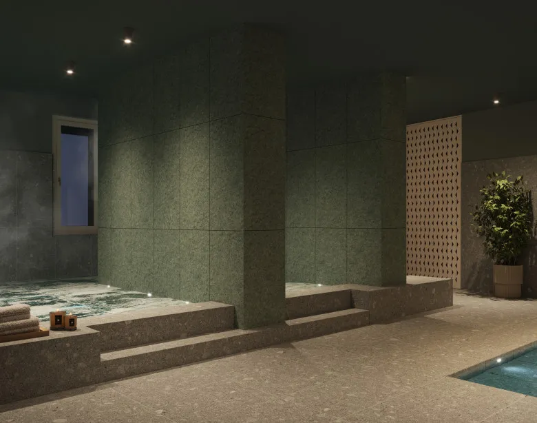 The high-ceilinged relaxation area, with its natural tones and soft lighting, creates a serene environment that invites you to unwind. The comfortable loungers and peaceful ambience make this the ideal place to free your mind.